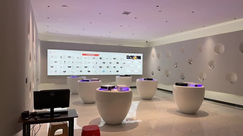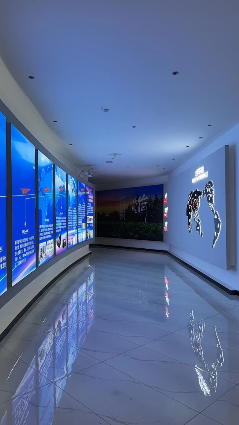 墙面与地面延续白色基调,展示区造型独特,如蛋形展台搭配紫色灯光,突出展品。大屏幕展示产品信息,方便参观者了解。墙面的世界地图与企业发展历程展示,彰显企业的国际化视野与发展历程,灯光设计柔和且富有层次感,提升参观体验。